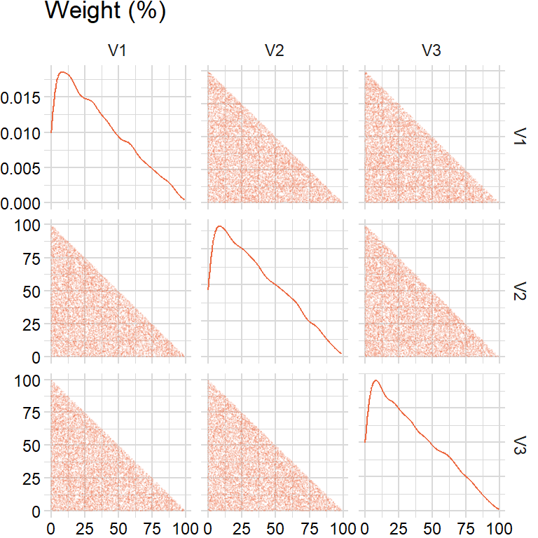 Approach 1: tempting to use \(w_{i}=\frac{u_{i}}{\sum_{j=1}^{N}u_{i}}\) where \(u_{i}\sim U(0,1)\) but the distribution of \(\mathbf{w}\) is not uniform